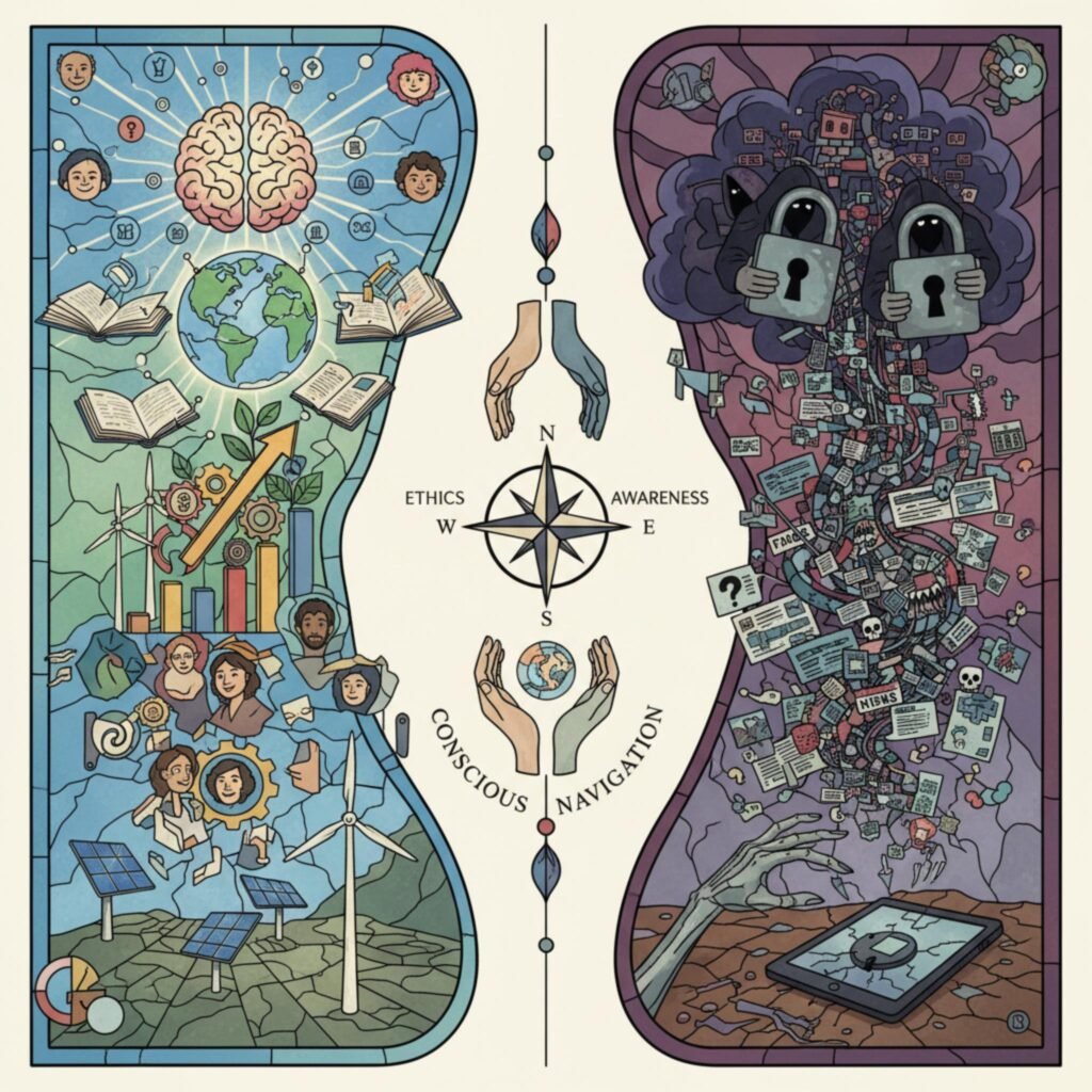Para navegar nesse futuro com sucesso, é fundamental que desenvolvamos uma consciência crítica sobre as ferramentas e plataformas que utilizamos. Precisamos abraçar as oportunidades exponenciais que a digitalização oferece, como a inovação contínua, a conectividade sem precedentes e a capacidade de personalização em escala. Ao mesmo tempo, é imperativo que enfrentemos proativamente os desafios, como a proteção da privacidade, o combate à desinformação, a promoção da inclusão digital e o desenvolvimento ético da inteligência artificial.